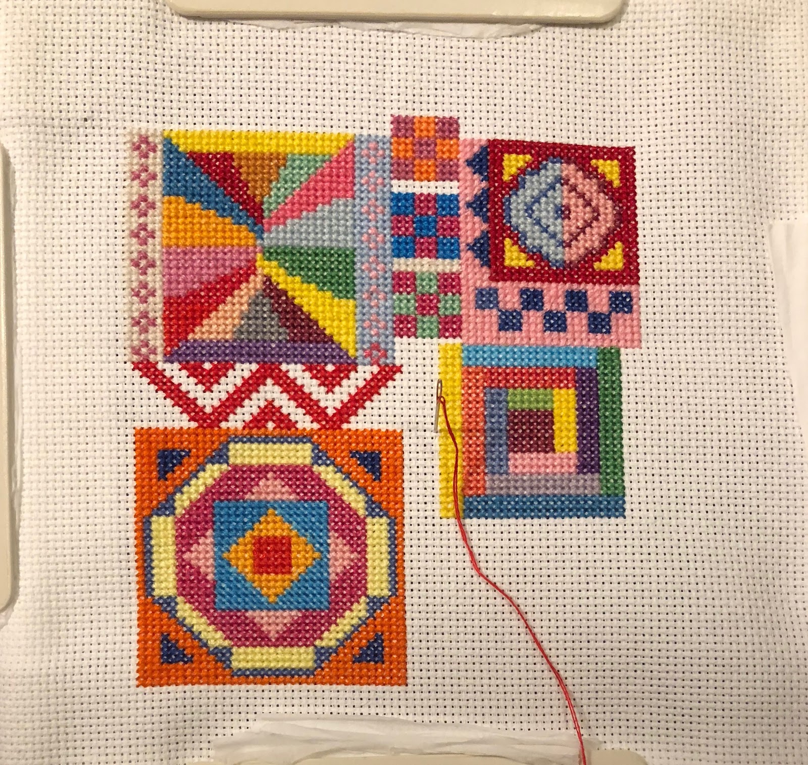 I started this when I was not feeling very well. Even following a pattern felt too much. I was knitting just something simple but then my hands started to hurt so had to put the knitting down. I though I needed something that does not require planning and thinking, I can just go on and stitch mindlessly. So I started stitching some geometrical shapes, and I realised that patchwork block motives are perfect for that. I also used up lots of leftover thread. Right now I am filling up the area between the bigger space. I am planning to make a cross stitch pattern from some of this, but even until then, I recommend everyone to give this a try. Stitch a small square. Then pick another colour, and stitch another square. And so on, see where it takes you. It is so relaxing and easy.